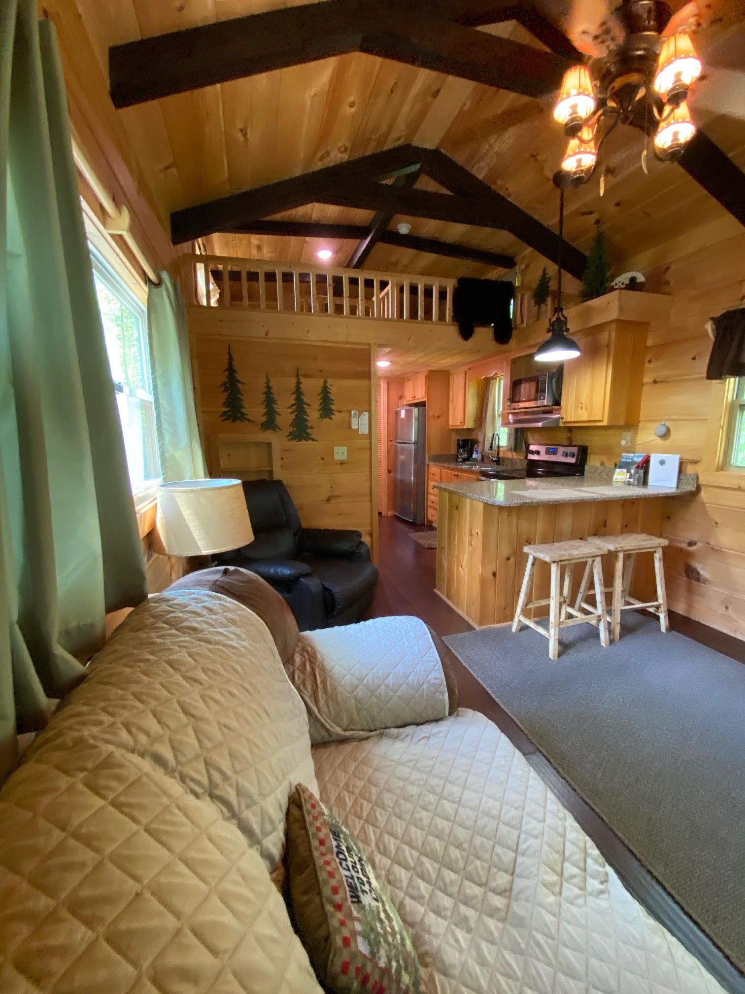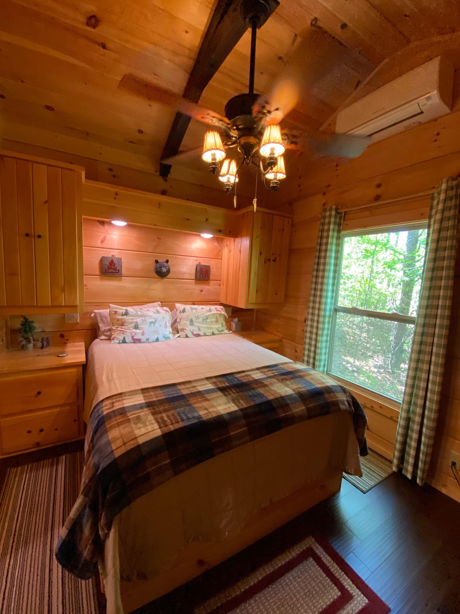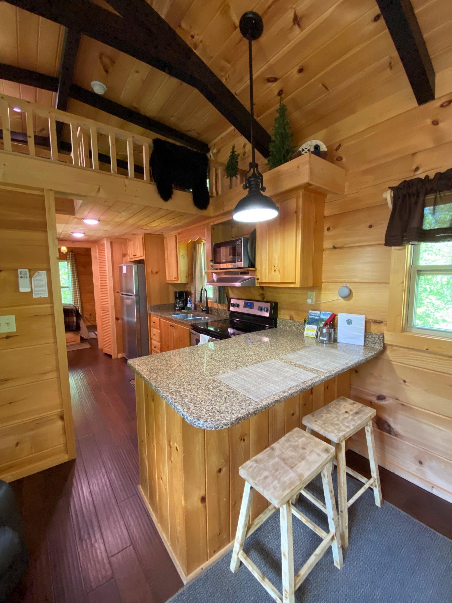 Step into the cabin through the screened-in porch, and you'll find yourself in the main room complete with a fully equipped kitchen, a dining area for two, and a comfortable living area with an electric fireplace. The main bedroom, located off the kitchen, provides a peaceful space to unwind. Climb the stairs to the low-ceiling loft, where you'll find an additional queen bed. And don't forget about the private hot tub, right next to the cabin, where you can relax and soak up the serenity.